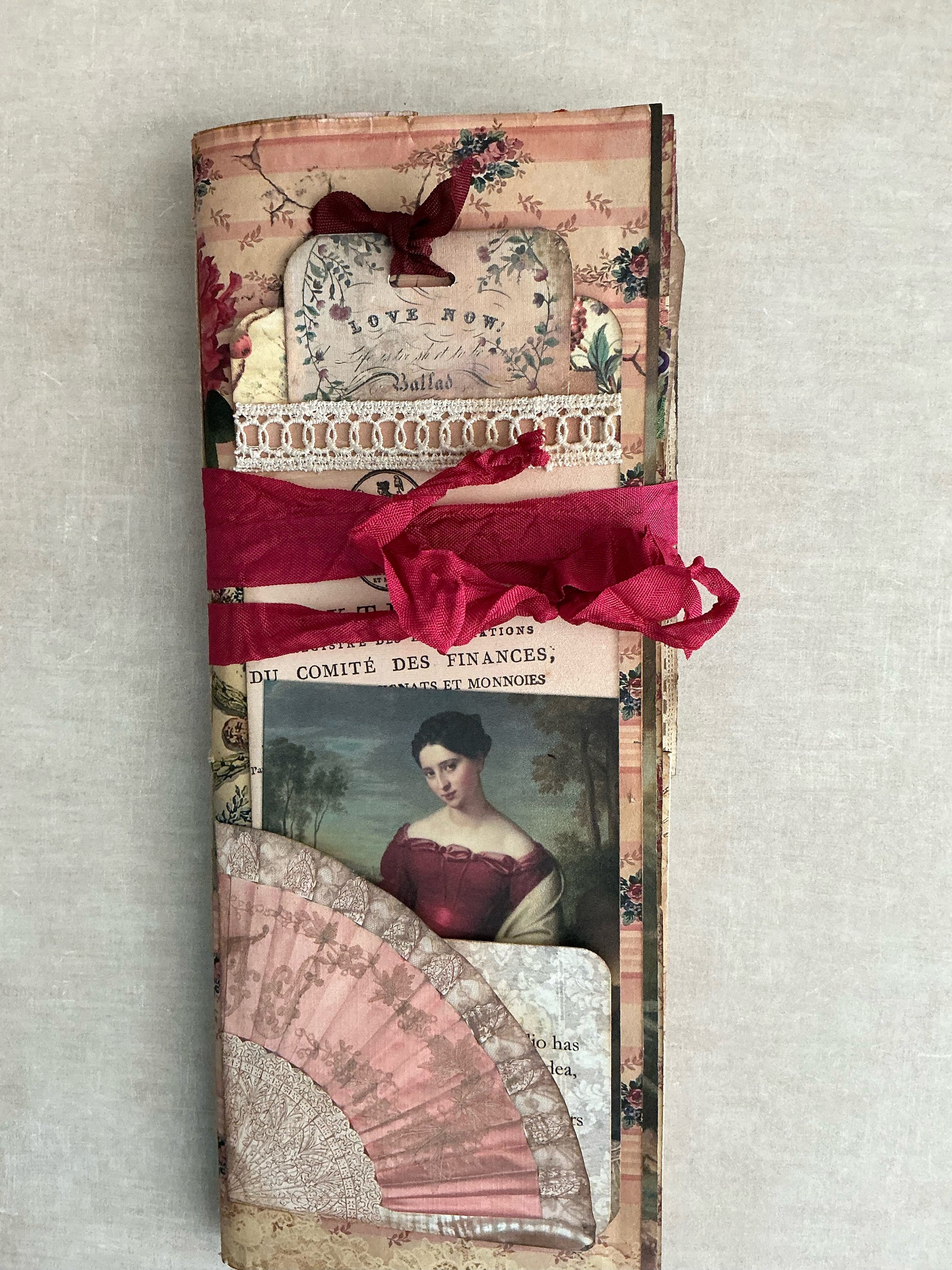 Vintage lace and modern lace hand-crinkled seam binding, beads, decorative paper clips, washi tape, hand stamping, inking, embossing, vintage photos.